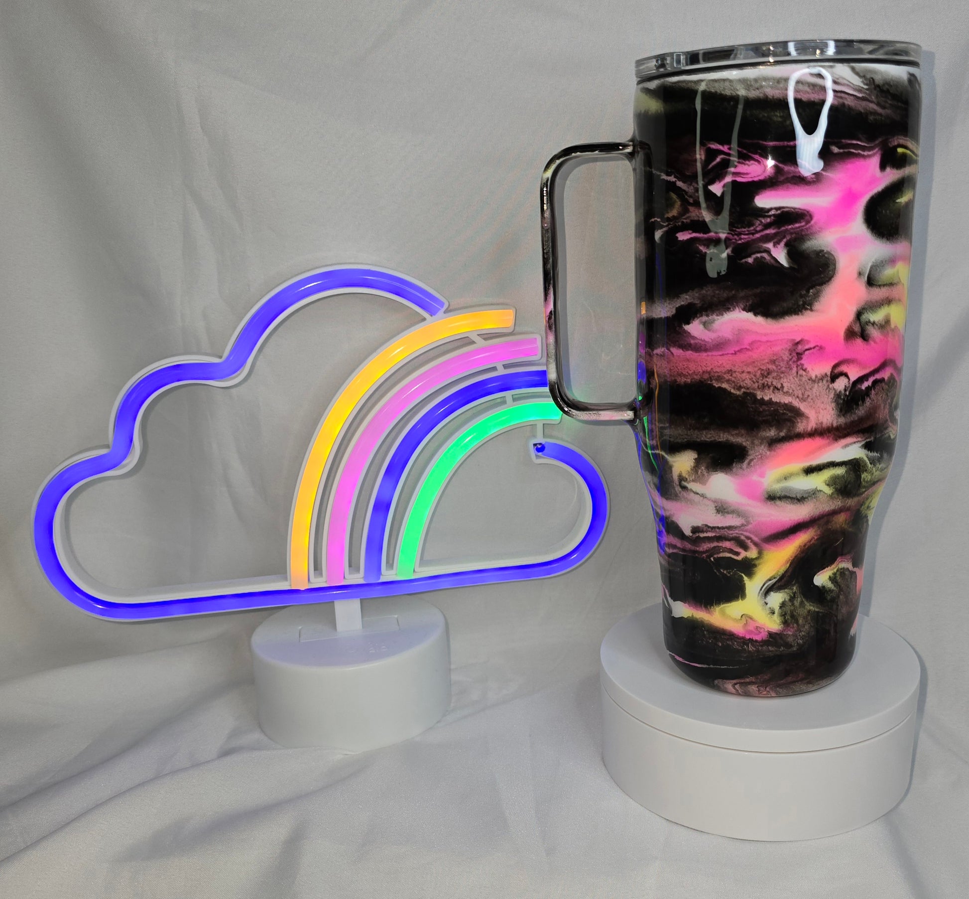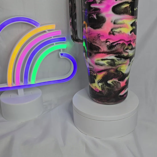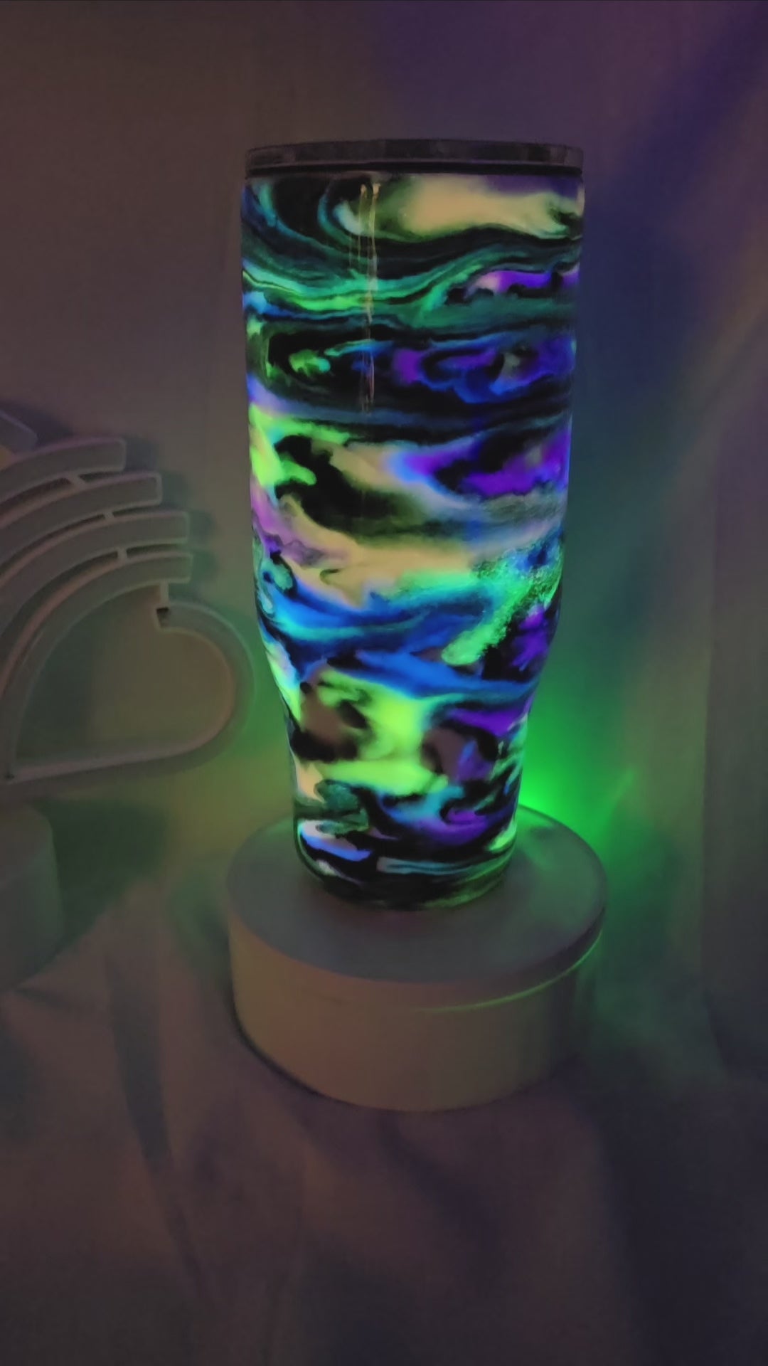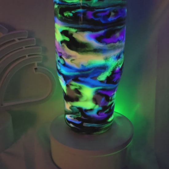 "Light up the party with our 24 oz glow in the dark tumbler! Perfect for late-night gatherings, this unique feature is sure to be a conversation starter. (Just don't put it in the dishwasher!)"