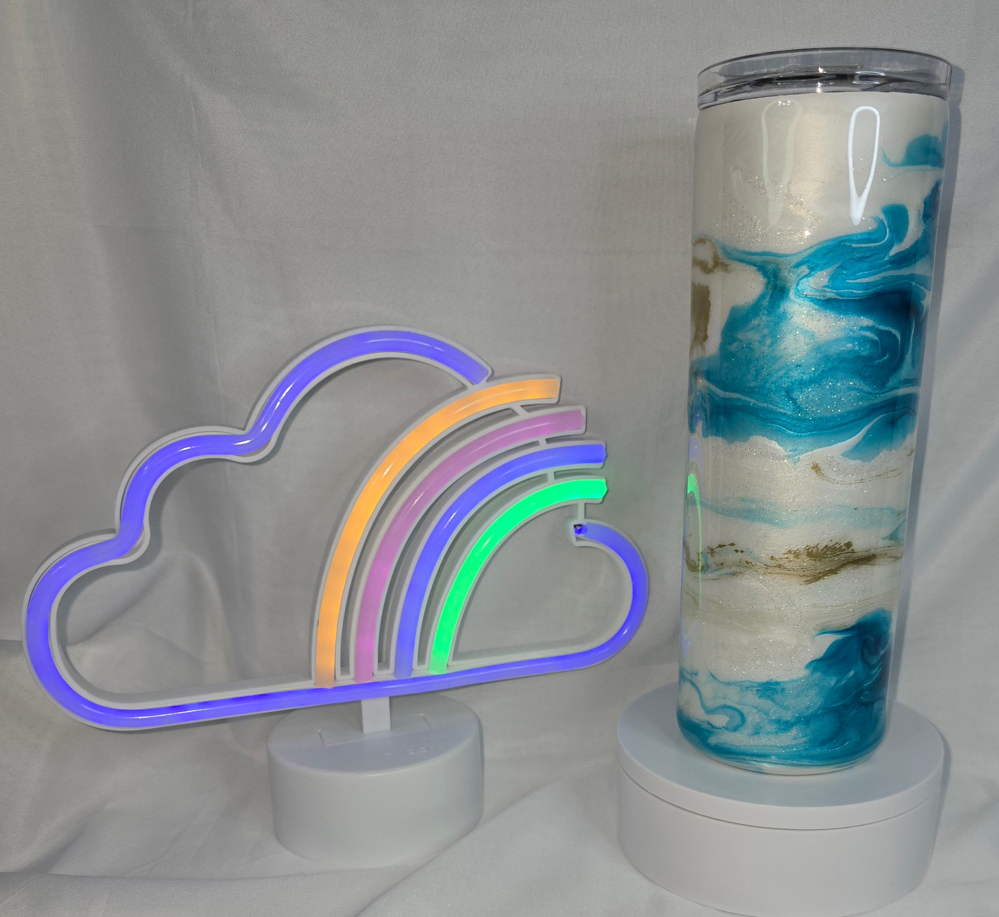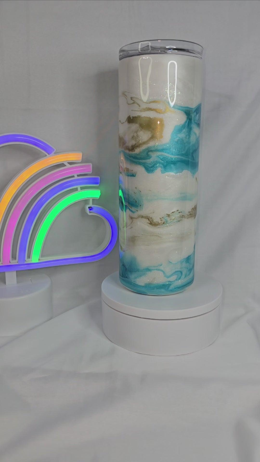 Sparkle and sip in style with our 137-Elegant Blue white and gold 20 oz epoxy tumbler. Made with durable stainless steel, this tumbler keeps your drink at the perfect temperature while you add a touch of elegance to your everyday routine. (Note: Not safe for dishwashers, but who needs one when you have this gorgeous tumbler?)