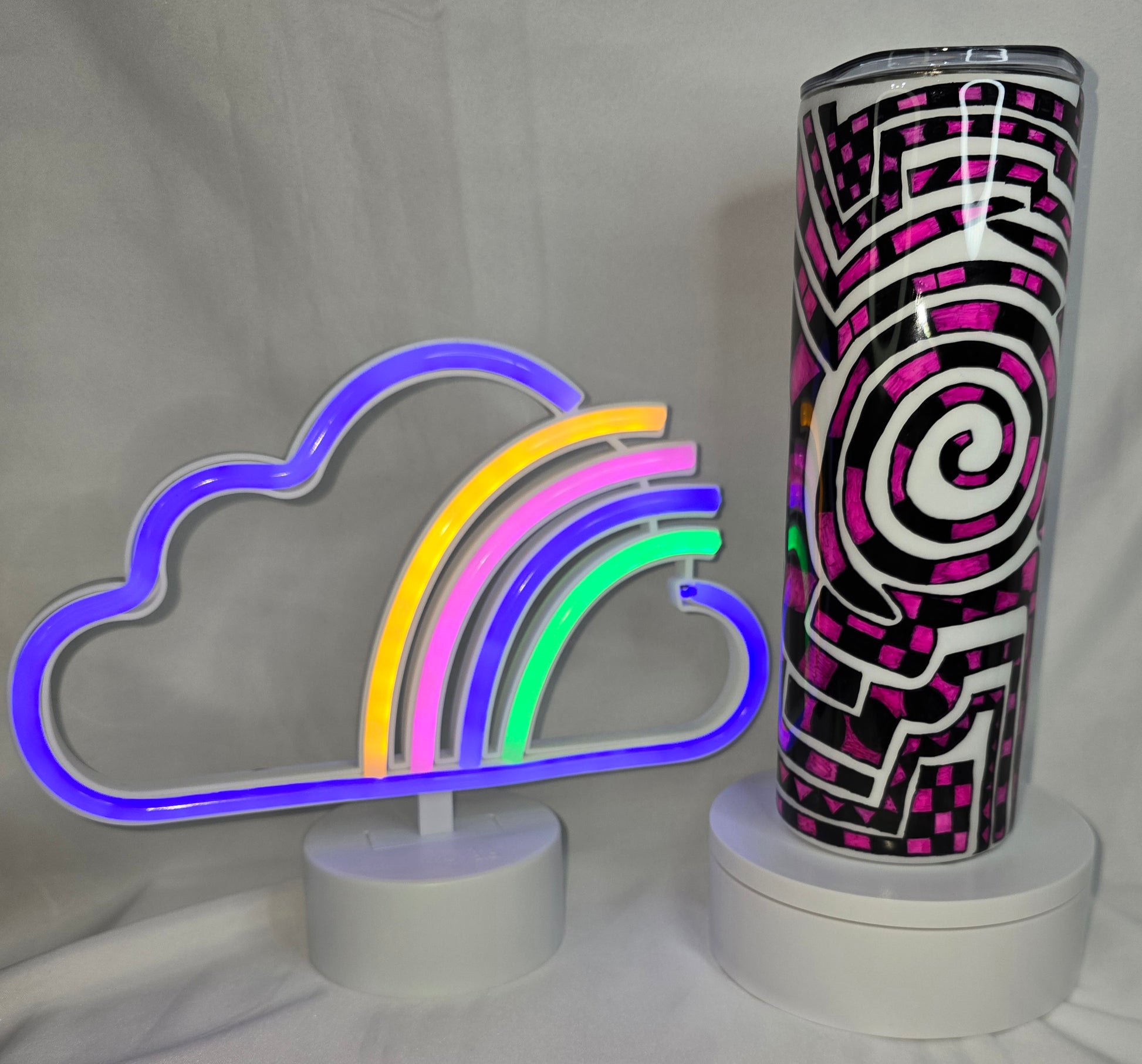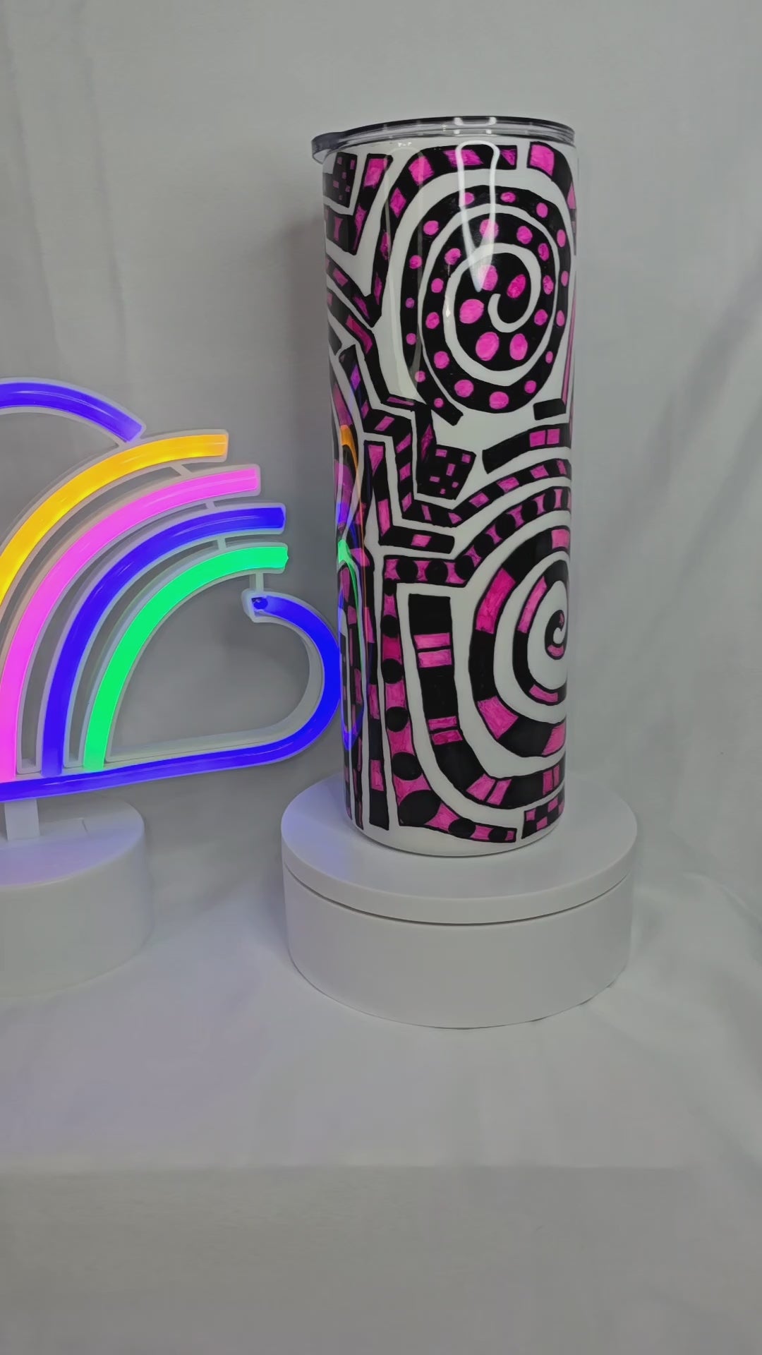 "Take a sip in style with our 20 oz stainless steel pink and black tangle art tumbler! (Not for dishwashing, sorry.) Stay trendy while keeping your drink at the perfect temperature. Perfect for any occasion, this stylish tumbler will become your daily go-to (and make all your friends jealous!) Cheers to that!"
