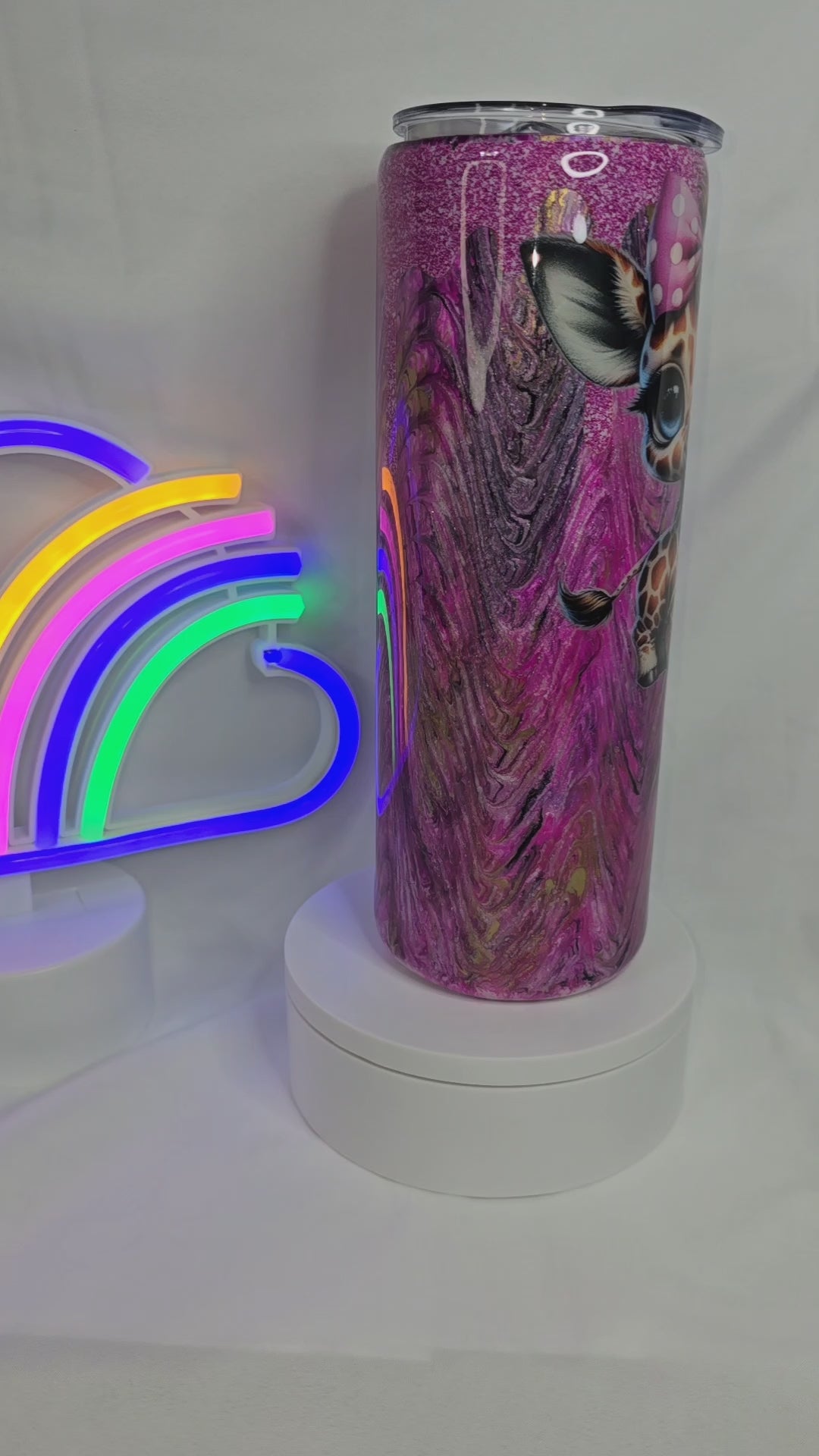 "Quench your thirst on-the-go with our 152- 20 oz purple giraffe tumbler! Made with durable stainless steel, this tumbler will keep your drinks hot or cold. (Just don't put it in the dishwasher - trust us, we learned the hard way.)"
