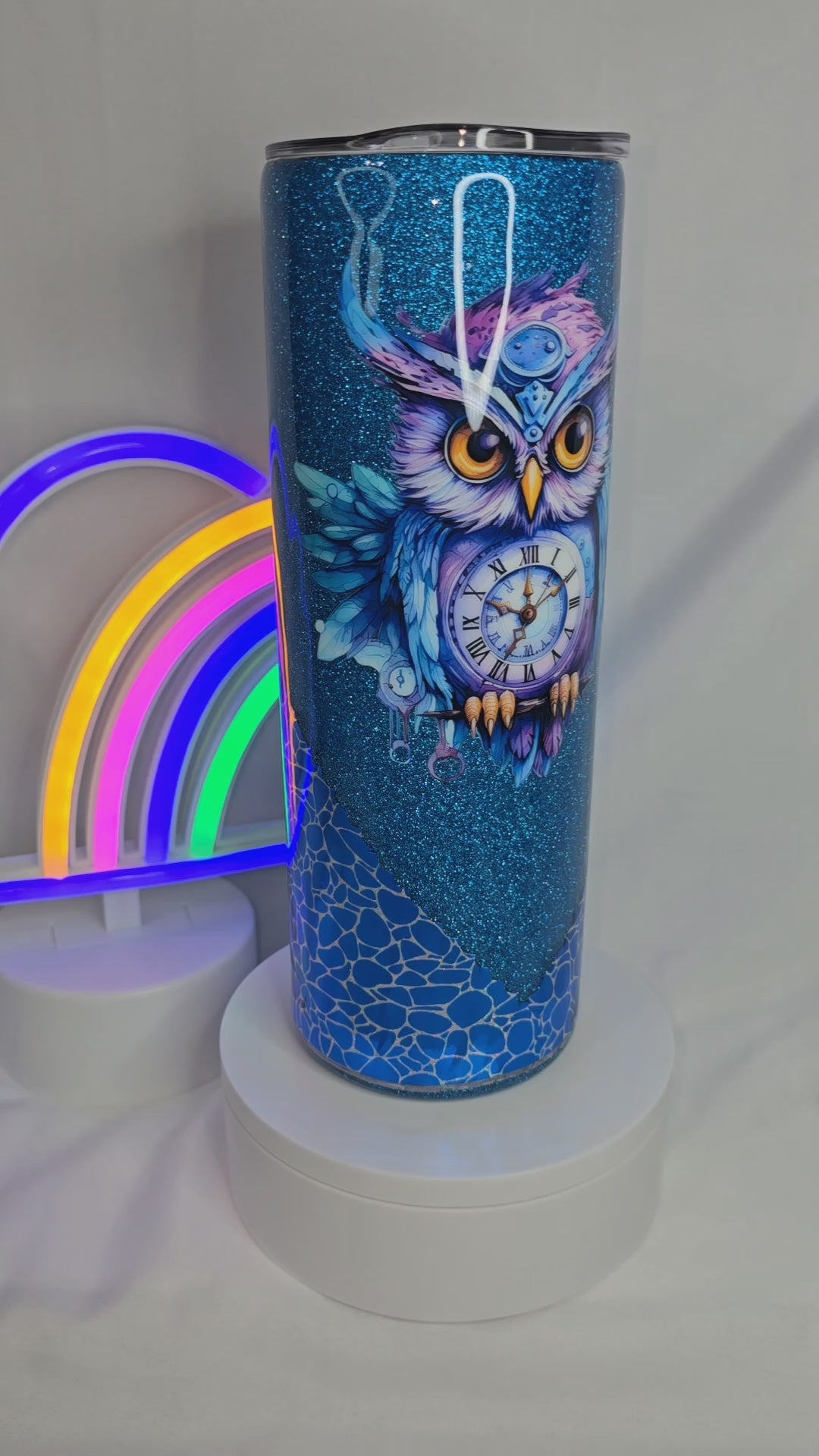 "Add a hoot to your daily hydration with our 169- Blue owl 20 oz tumbler! This charming cup, adorned with an owl design, will keep your drinks cold for hours. Not dishwasher safe. Drink up!"