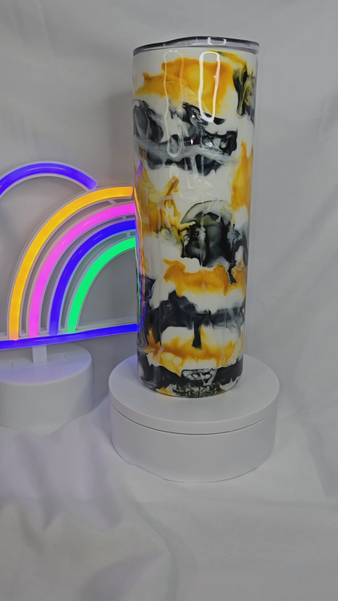 "Spice up your daily sips with our 178- 20 oz black and yellow ink drop tumbler! Not just a stylish accessory, this tumbler is the perfect on-the-go companion for your favorite beverages. (Not for dishwashers, they're not ready for this level of cool.)"