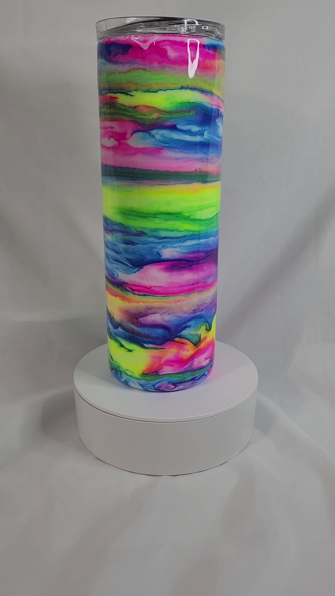 "Stir up some fun with this 20 oz neon alcohol ink and epoxy tumbler, created on Tiktok live. Plus, it comes with a reusable plastic straw! Stay stylish and sustainable with every sip. Cheers!"