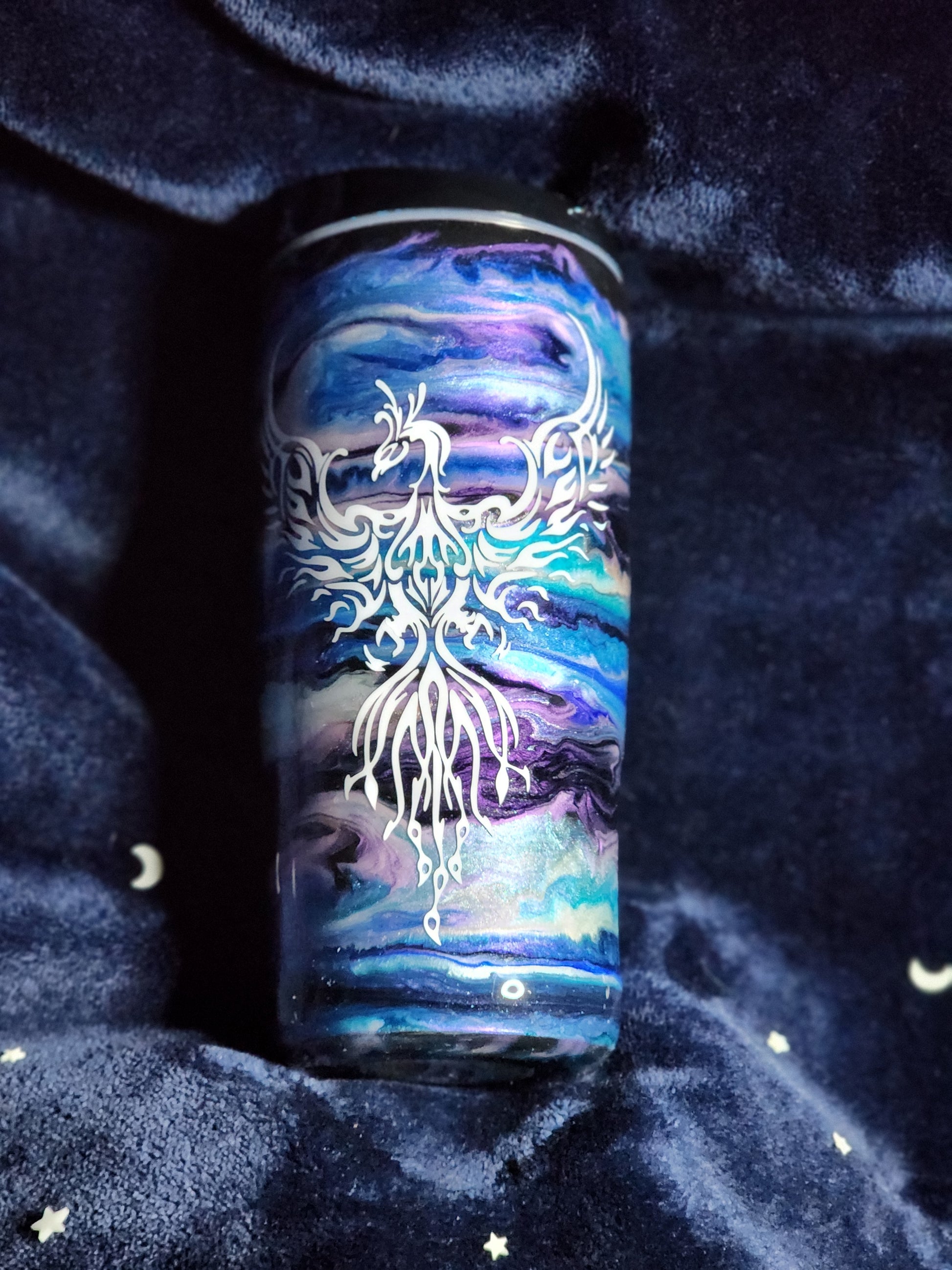 Bring a touch of mystical magic to your next gathering with this eye-catching 20 oz. tumbler! Featuring an idyllic mix of blue and purple, plus a majestic Phoenix to top it off, this cup is sure to be the star of the party!