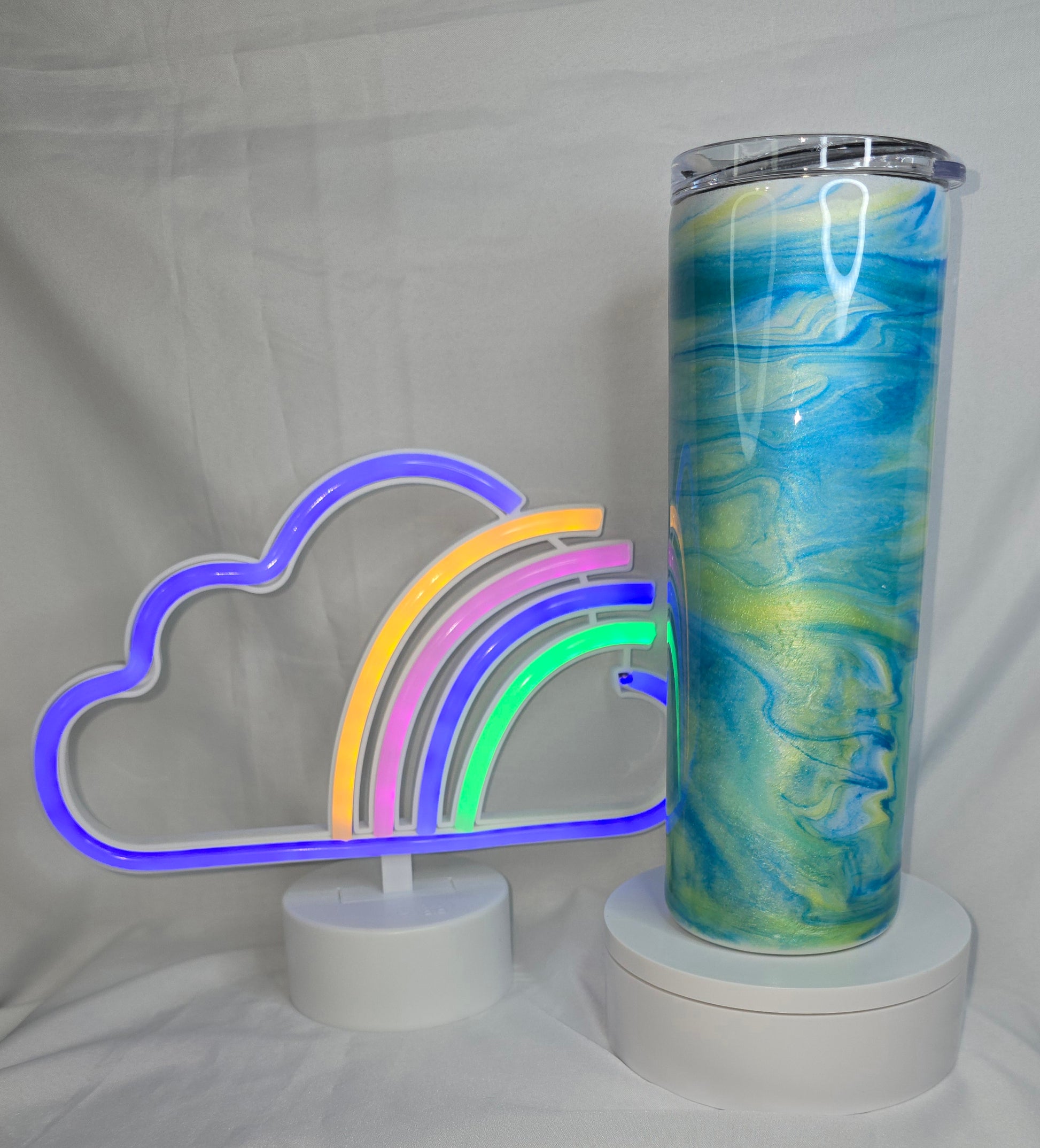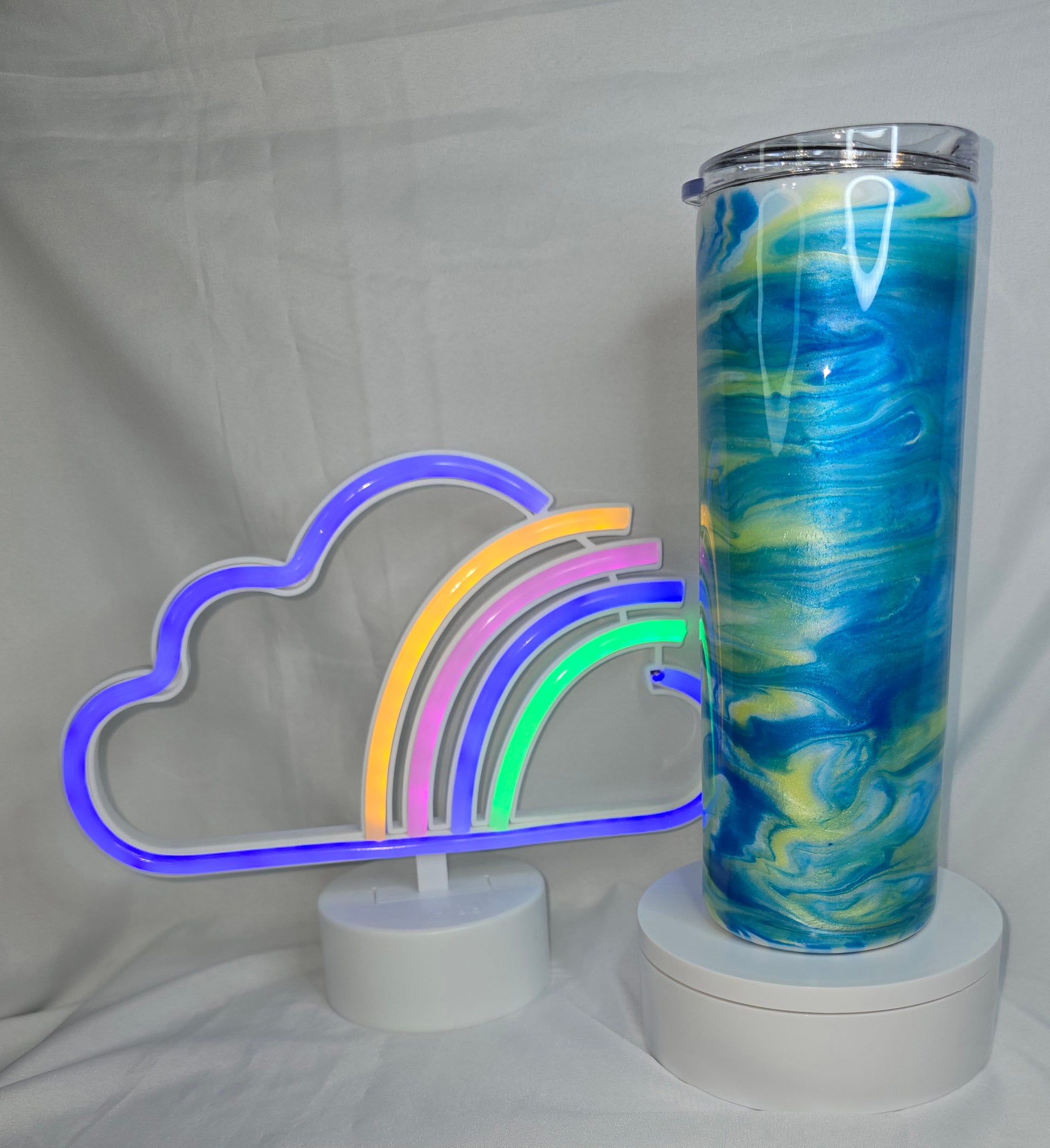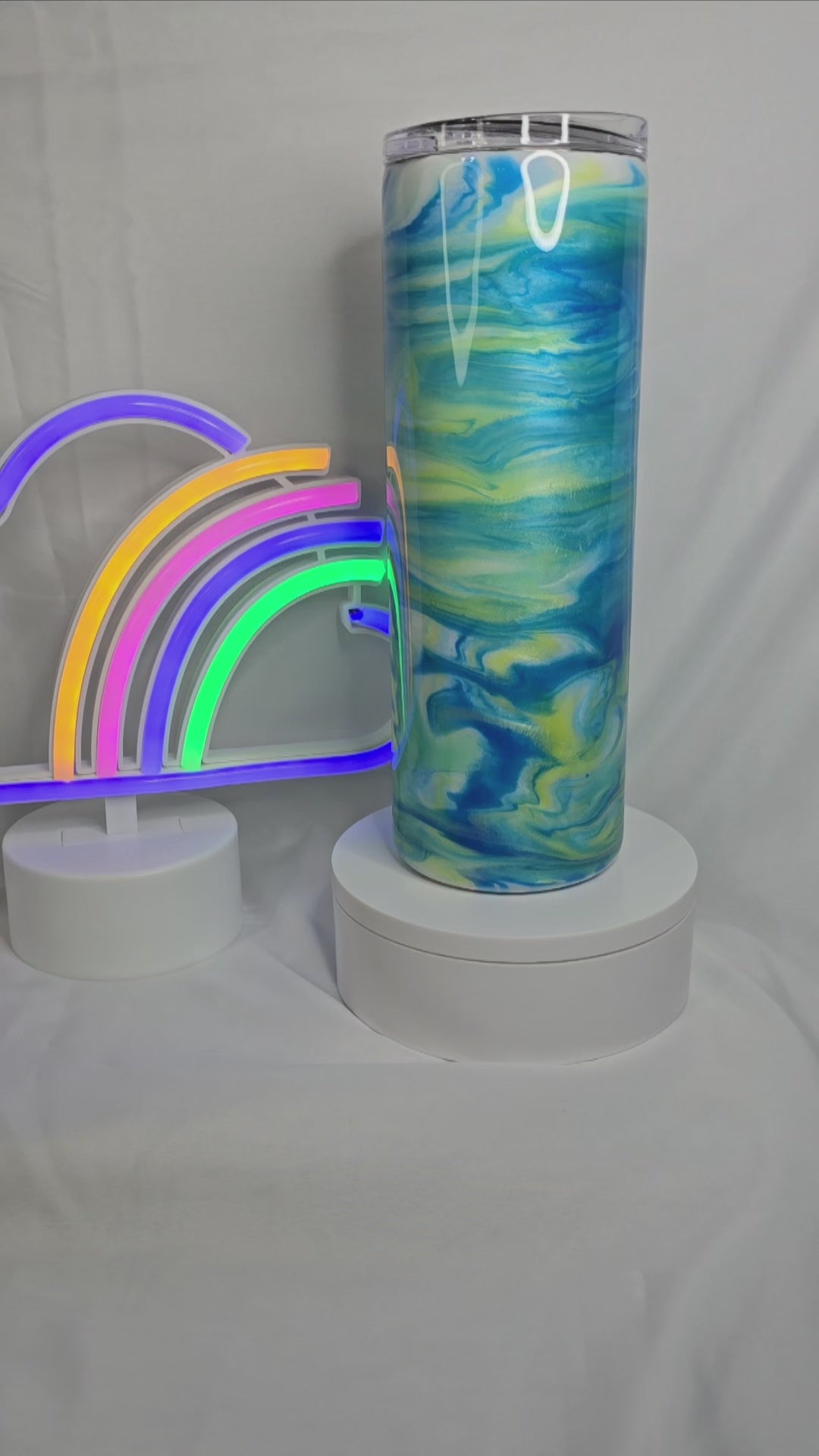 "Stay hydrated and stylish with this blue and yellow 20oz stainless tumbler. Keep your drinks at the perfect temperature while on the go. (Note: Not suitable for the dishwasher, but perfect for adding a pop of color to your daily routine!)"