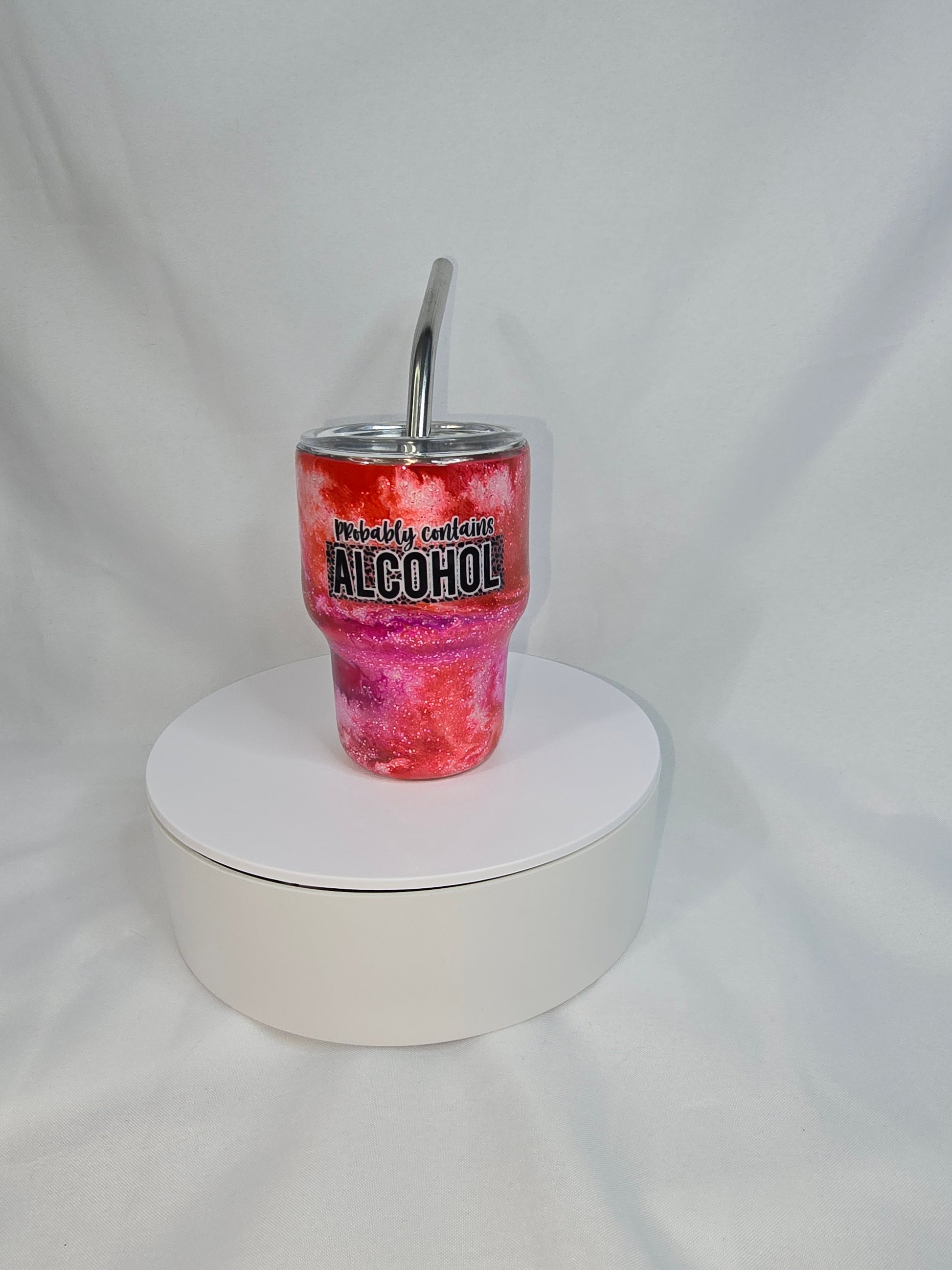 "Toast to a good time with our 3 oz shot glass that features a playful "may contain alcohol" statement. Comes with a bonus stainless straw for added fun. Cheers!"