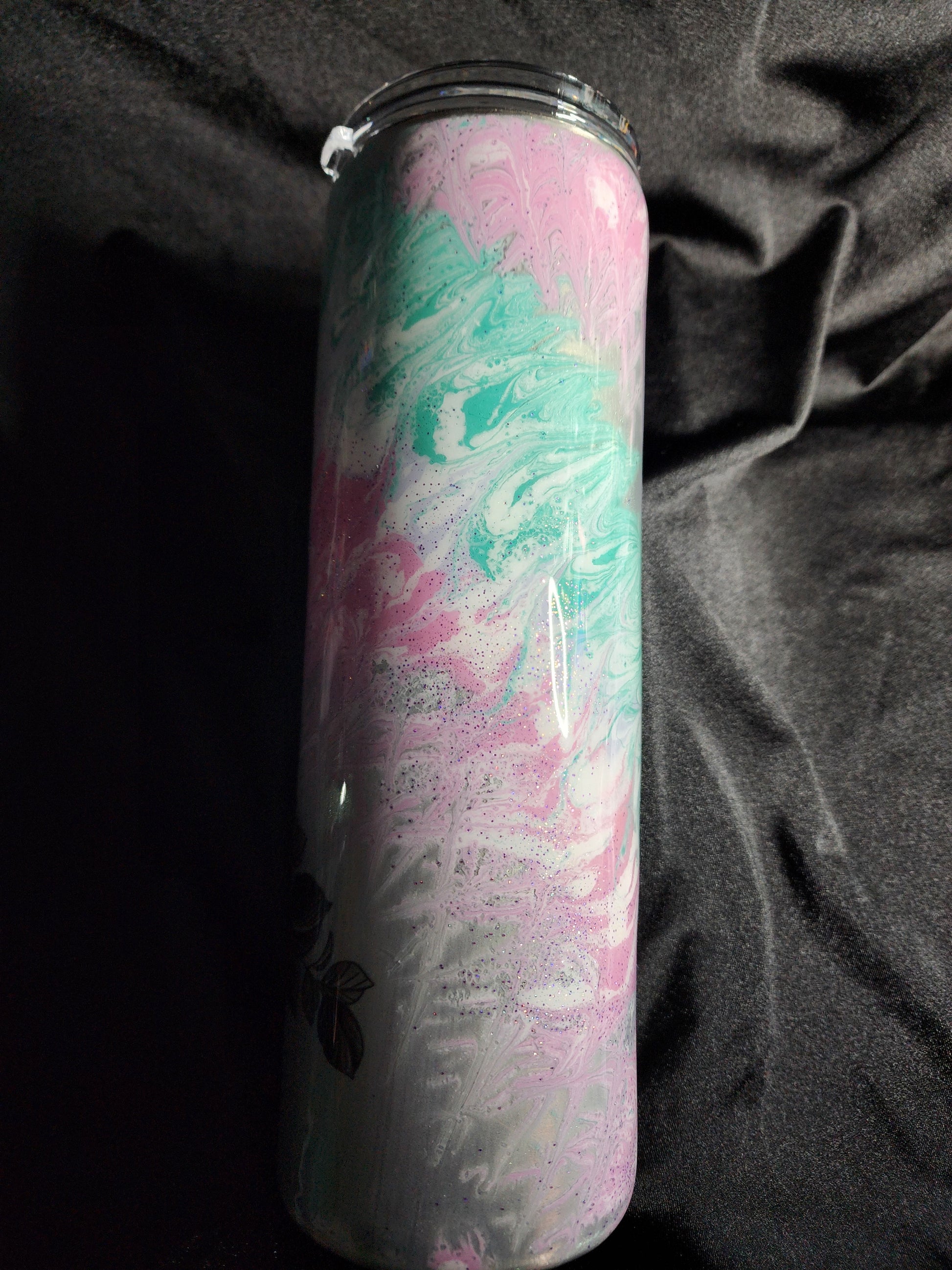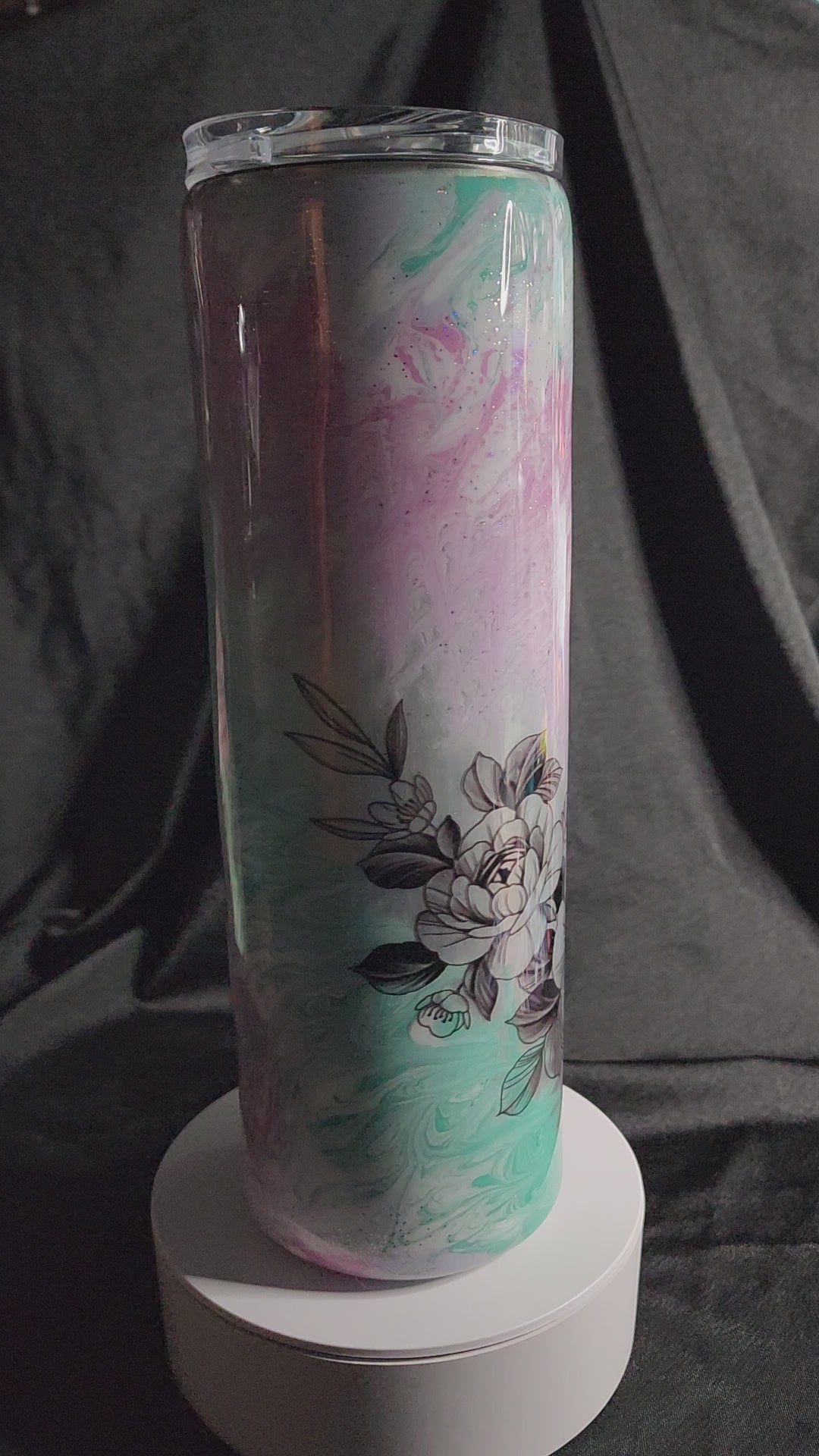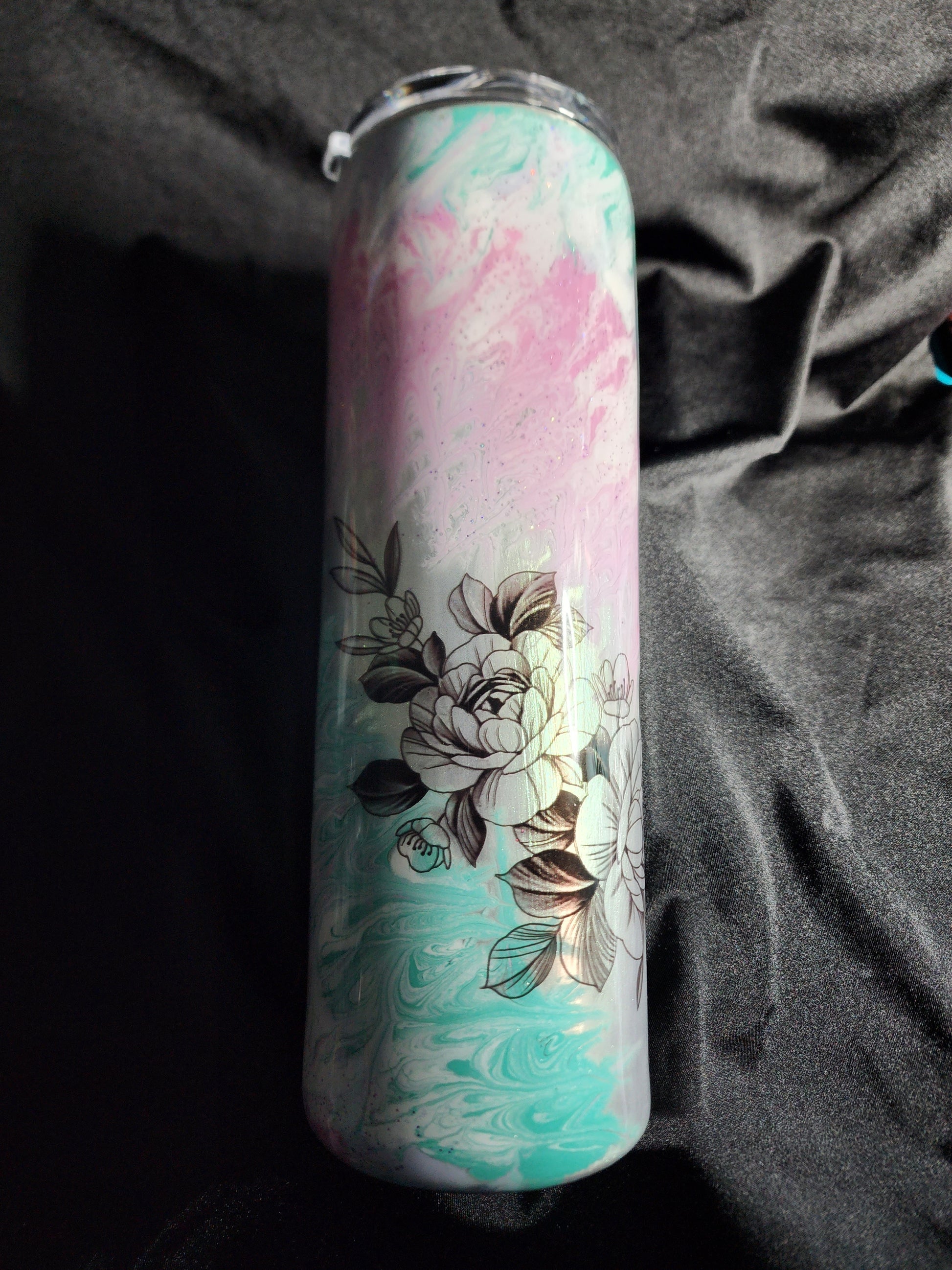 Sip your favorite drink in style with this flower vine tumbler! The 30oz cup features beautiful pink, green, and silver colors, plus an eye-catching pattern. Make a statement while staying hydrated!