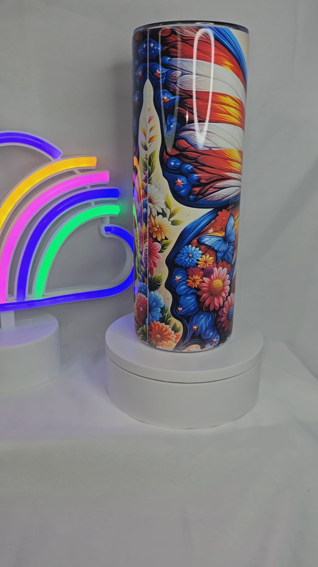 "Stand out from the crowd with our S37 Patriotic Butterfly tumbler! Made of durable stainless steel, it holds 20 oz of your favorite beverage while showcasing a beautiful butterfly design. Perfect for keeping your drinks at just the right temperature. (Sorry, not dishwasher safe!)"