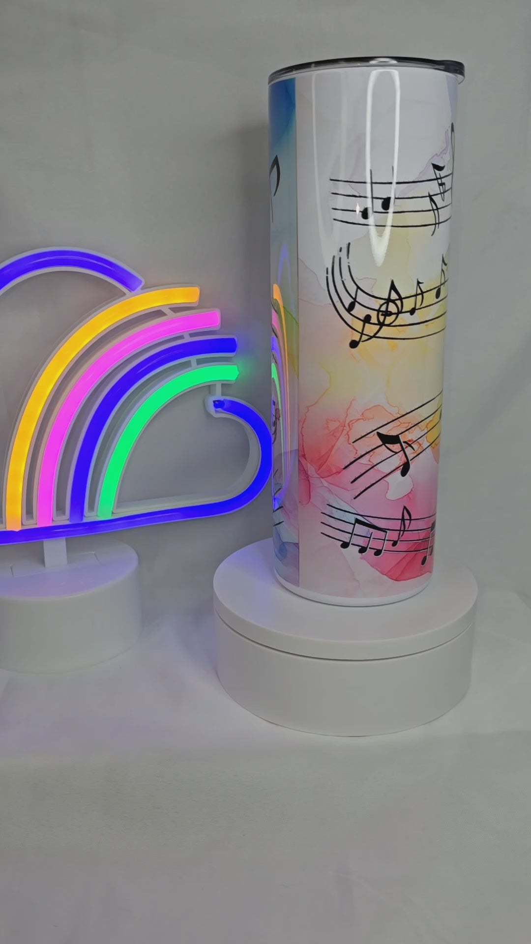 This tumbler will have you singing its praises! With colorful music notes and durable stainless steel construction, this 20 oz sublimated tumbler is perfect for music lovers on the go. (Warning: not equipped for dishwasher performances.)