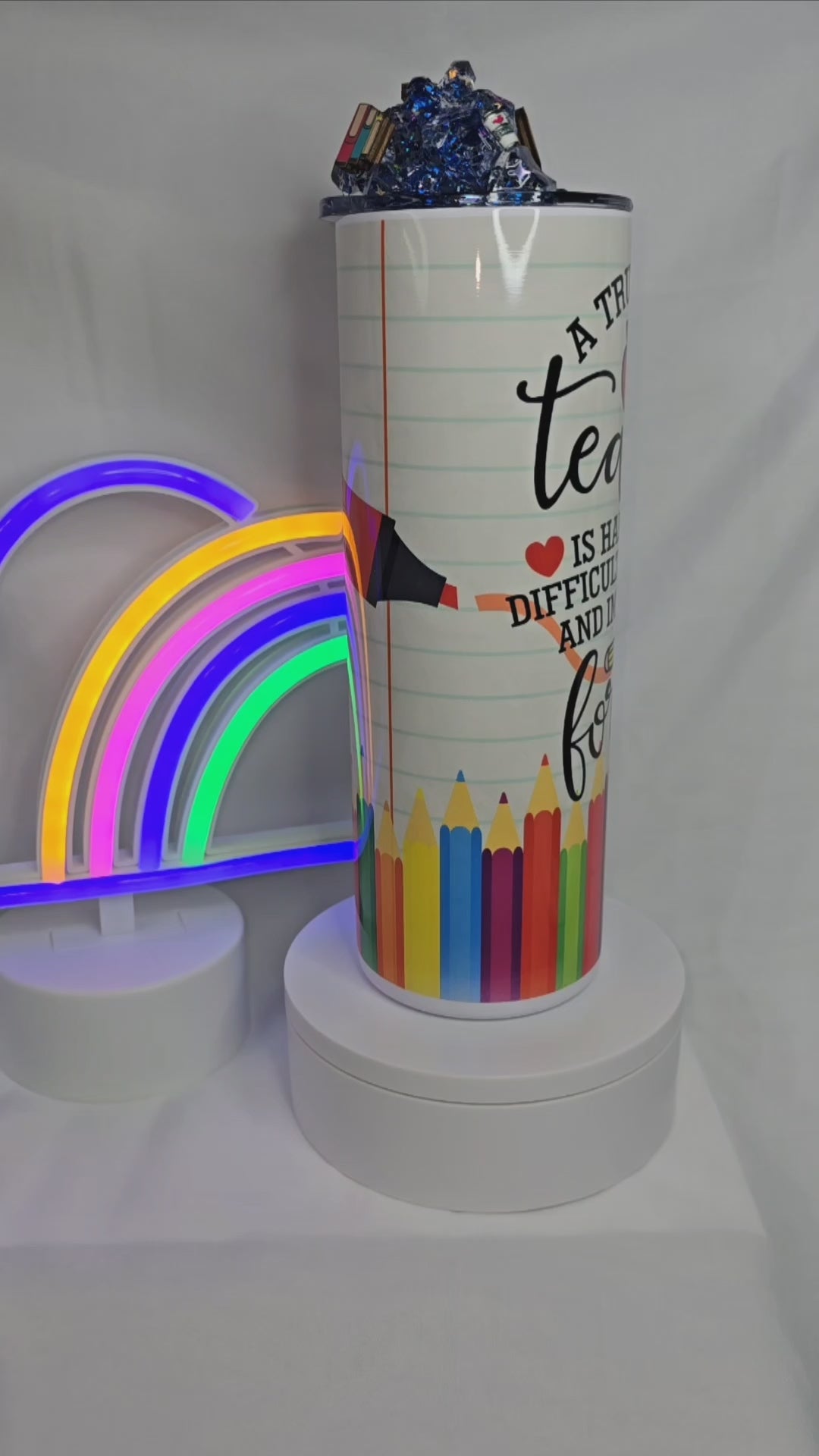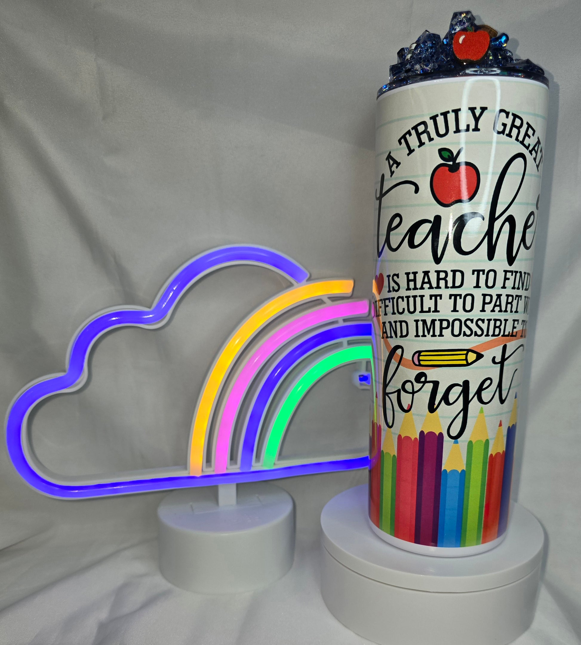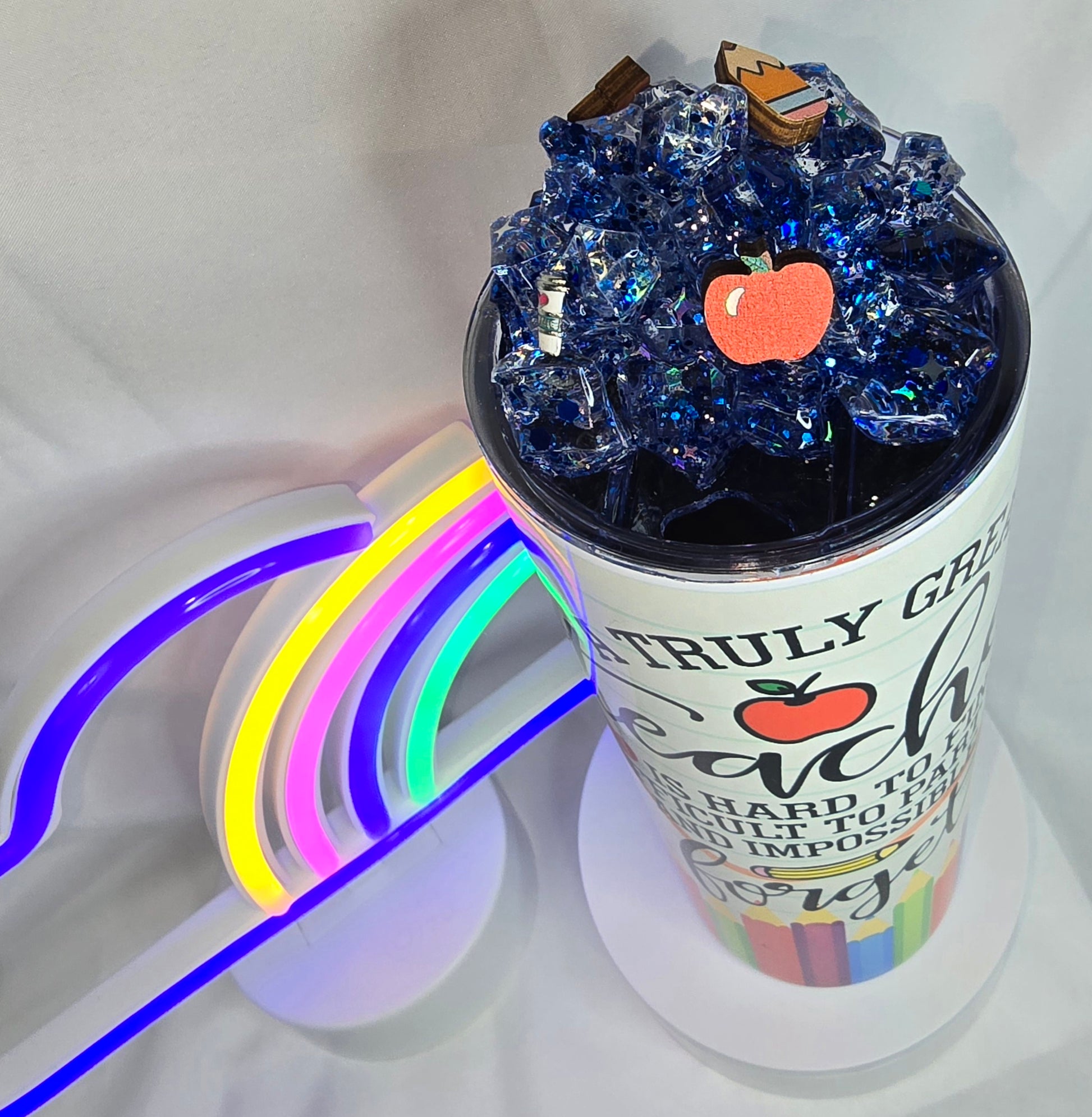 "A truly great teacher is hard to find, difficult to part with and impossible to forget". This 20 oz sublimated tumbler comes with a decorative topper and also comes with a regular top. This would make a great gift for that great teacher in your life! (Tumbler is not recommended for dishwasher)