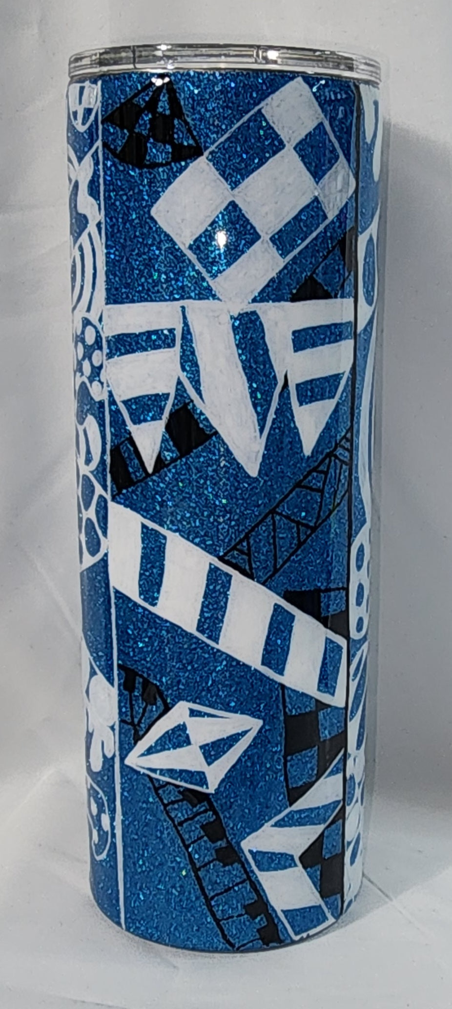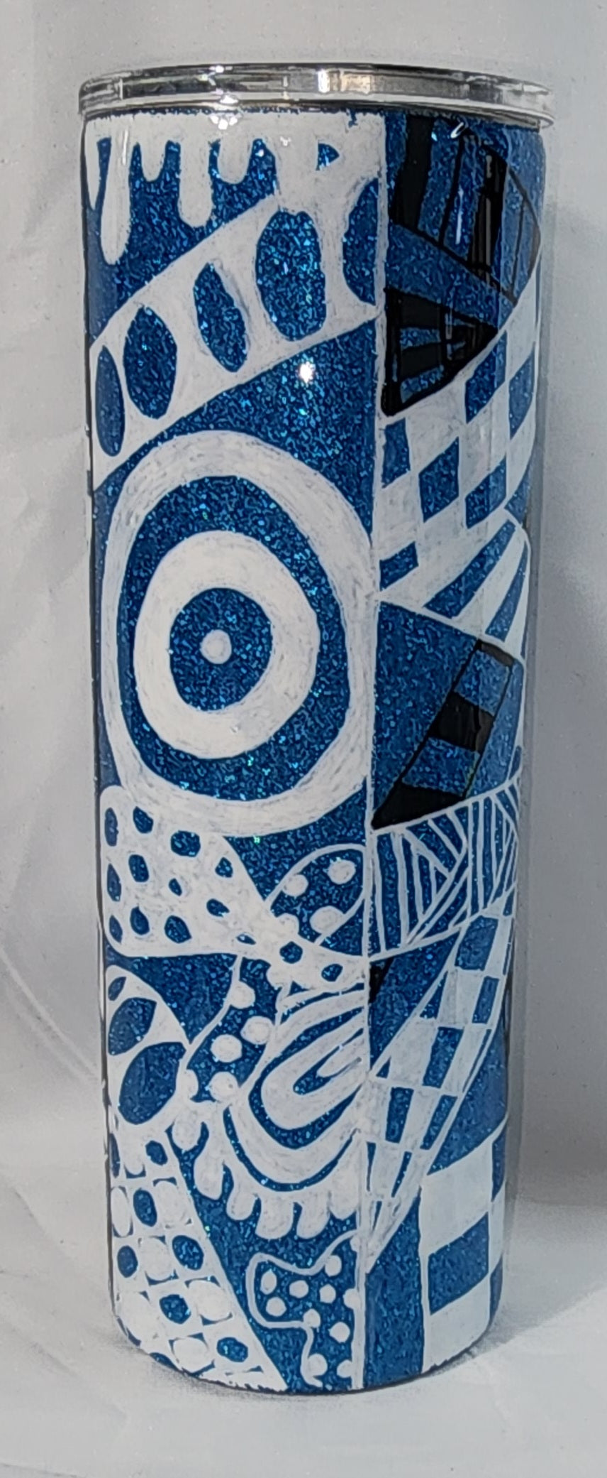 Flaunt your Tangle Art with this one-of-a-kind 20oz Skinny, featuring a unique mix of black and white Zentangle designs on a dazzling blue glitter base. The epoxy finish adds extra durability and a smooth finish, while the hand drawn design means it's truly one of a kind! Wowzers!