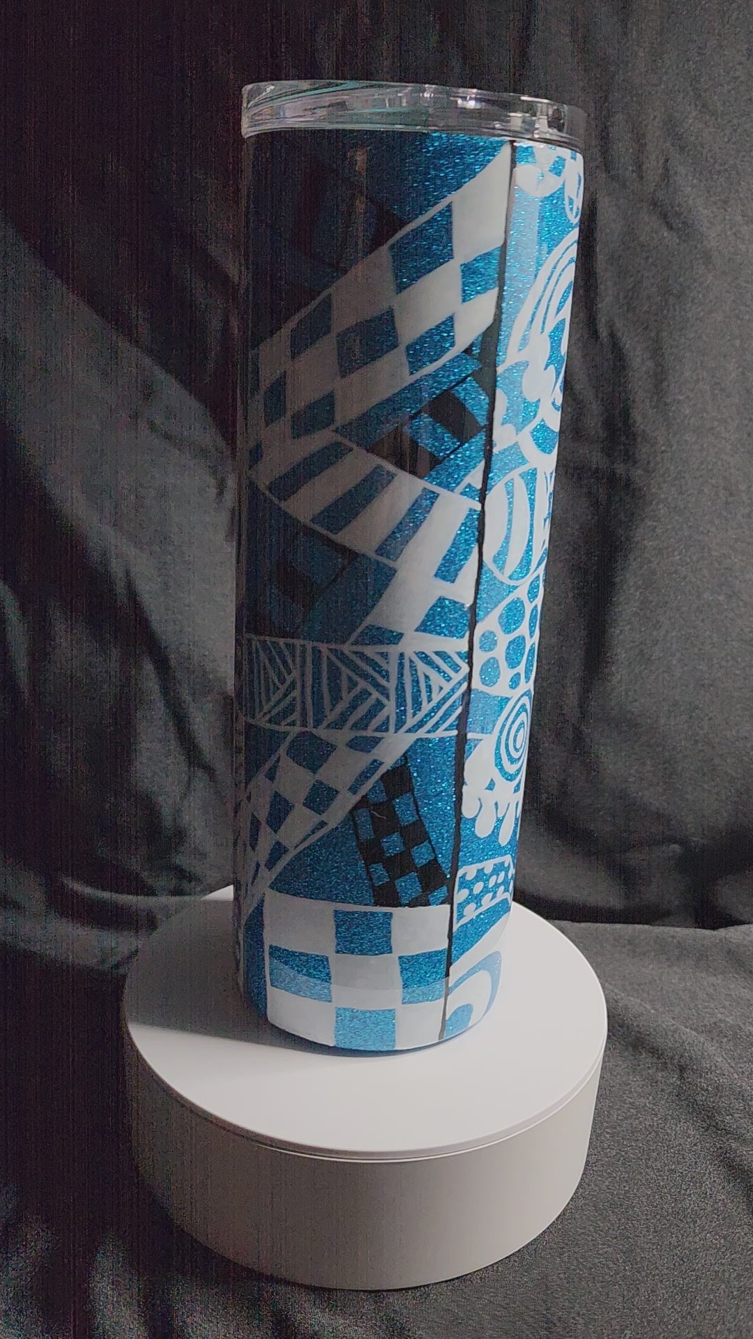 12-White and Black Tangle Art on blue glitter base 20oz Skinny Tumbler