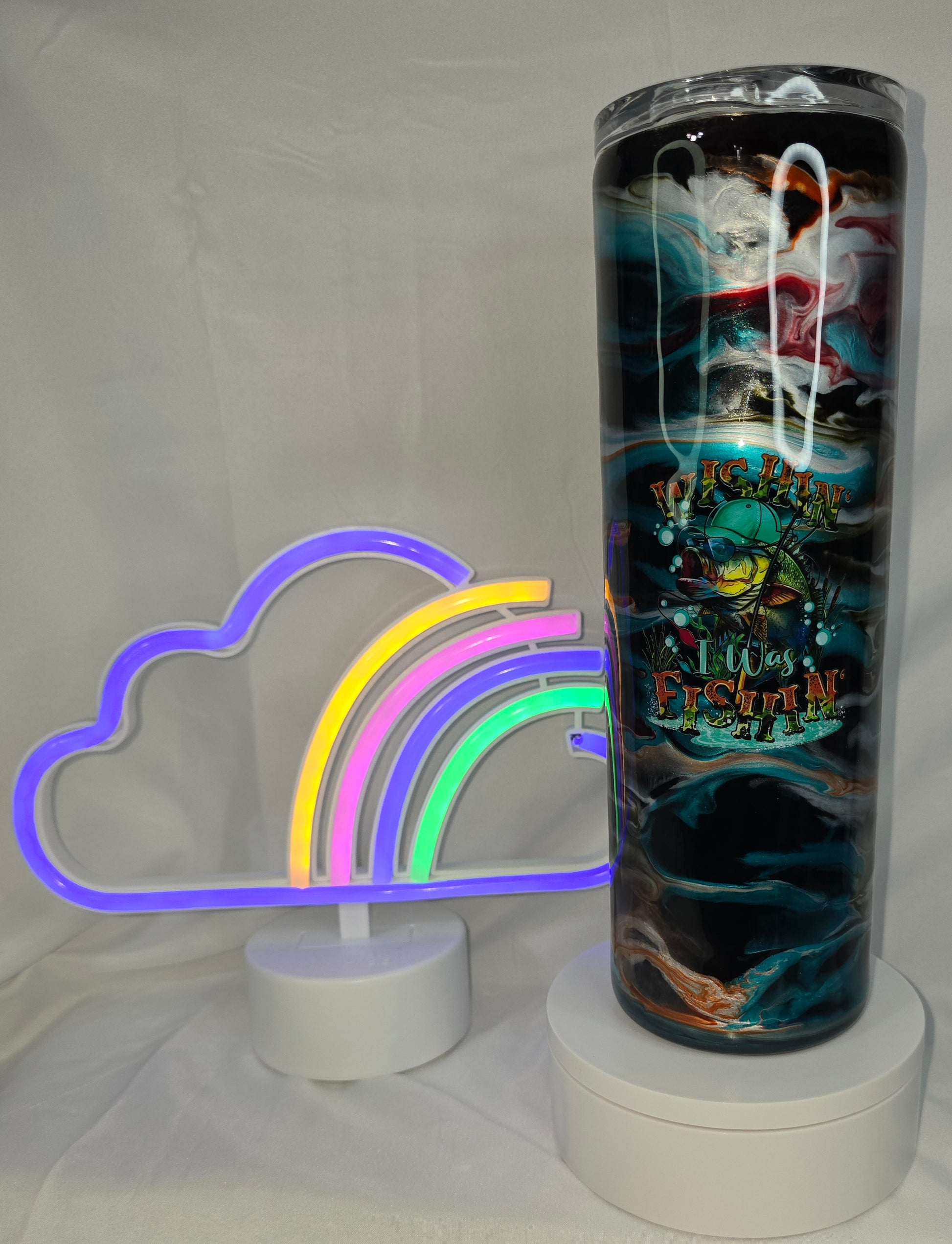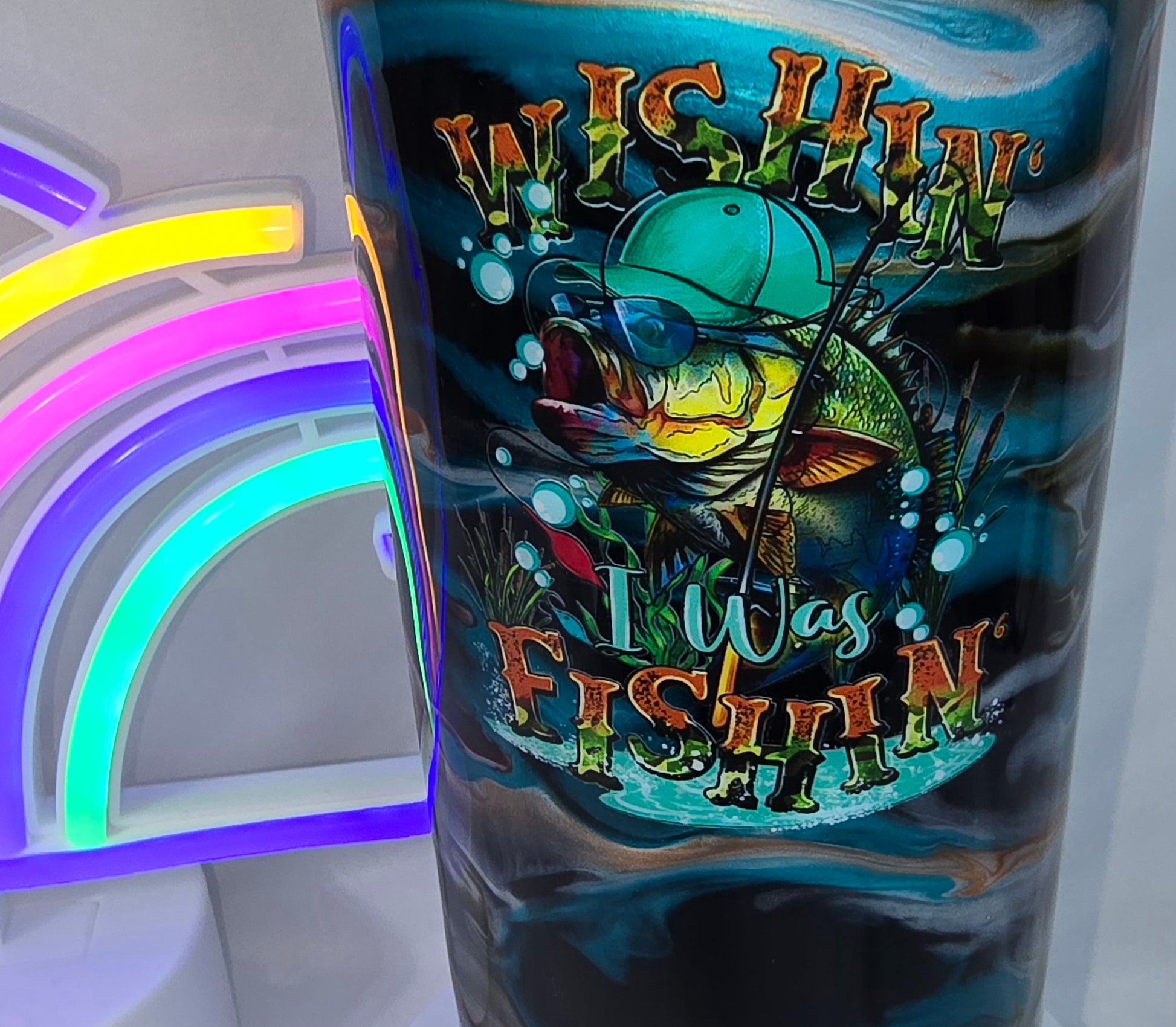 "Reel in the compliments with our Wishing I was fishing 30 oz tumbler! Perfect for keeping your drinks at the perfect temperature while you're out on the water. Just don't let it take a dip in the dishwasher (it's not a fan).